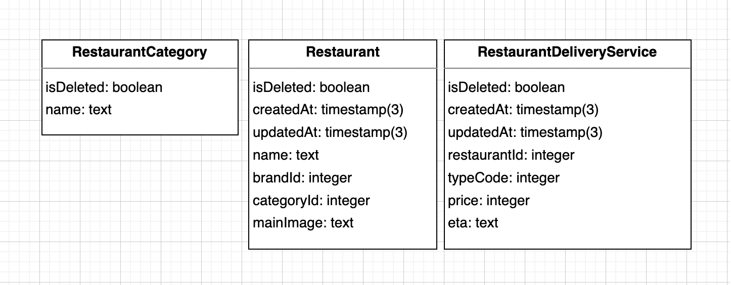restaurantId, TypeCode(한집배달, 세이브배달 별로 가격이 다를테니 테이블 분리.. 아직 이 부분은 어떻게 해야할지 모르겠어서 아마 조금 더 진행되면 테이블 구성 변경될 듯!!), 배달비, eta
