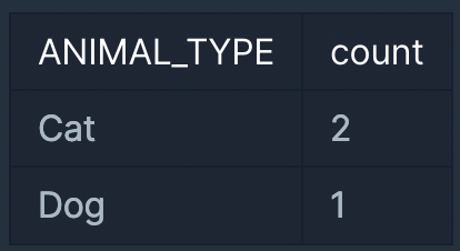 고양이는 2마리, 개는 1마리 들어왔습니다. 따라서 SQL문을 실행하면 다음과 같이 나와야 합니다.