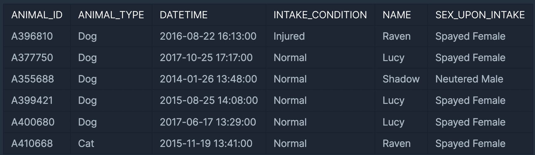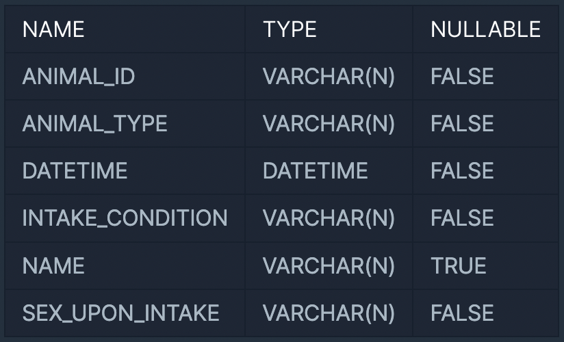 ANIMAL_INS 테이블은 동물 보호소에 들어온 동물의 정보를 담은 테이블입니다. ANIMAL_INS 테이블 구조는 다음과 같으며, ANIMAL_ID, ANIMAL_TYPE, DATETIME, INTAKE_CONDITION, NAME, SEX_UPON_INTAKE는 각각 동물의 아이디, 생물 종, 보호 시작일, 보호 시작 시 상태, 이름, 성별 및 중성화 여부를 나타냅니다.