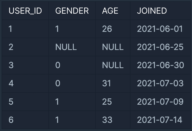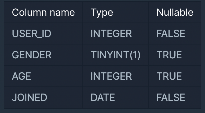 GENDER 컬럼은 비어있거나 0 또는 1의 값을 가지며 0인 경우 남자를, 1인 경우는 여자를 나타냅니다.