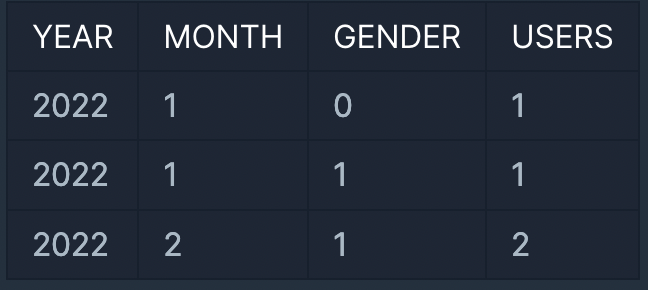 년, 월, 성별 별로 상품을 구매한 회원수를 집계하고, 년, 월, 성별을 기준으로 오름차순 정렬하면 다음과 같은 결과가 나와야 합니다.