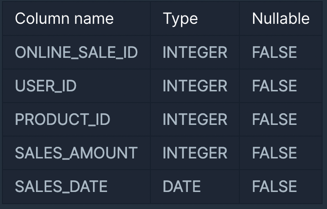 ONLINE_SALE 테이블은 아래와 같은 구조로 되어있으며, ONLINE_SALE_ID, USER_ID, PRODUCT_ID, SALES_AMOUNT, SALES_DATE는 각각 온라인 상품 판매 ID, 회원 ID, 상품 ID, 판매량, 판매일을 나타냅니다.