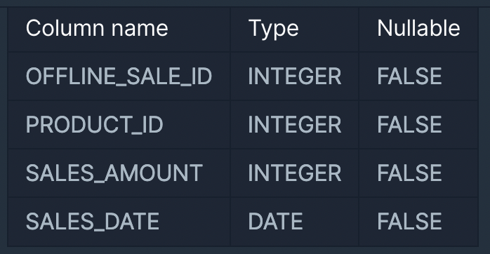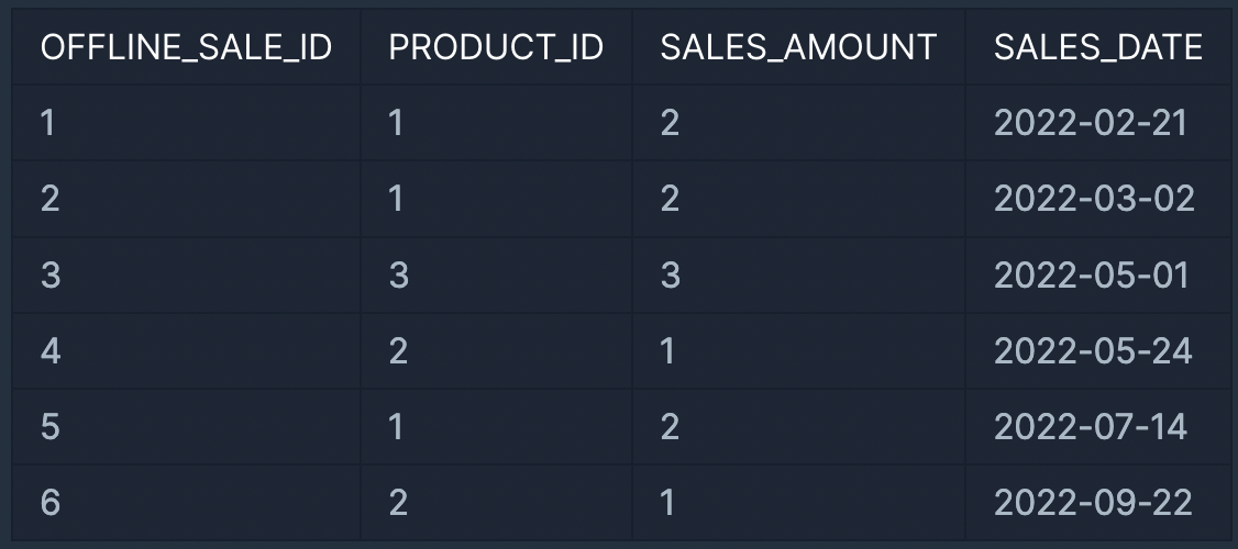 OFFLINE_SALE 테이블은 아래와 같은 구조로 되어있으며 OFFLINE_SALE_ID, PRODUCT_ID, SALES_AMOUNT, SALES_DATE는 각각 오프라인 상품 판매 ID, 상품 ID, 판매량, 판매일을 나타냅니다.
