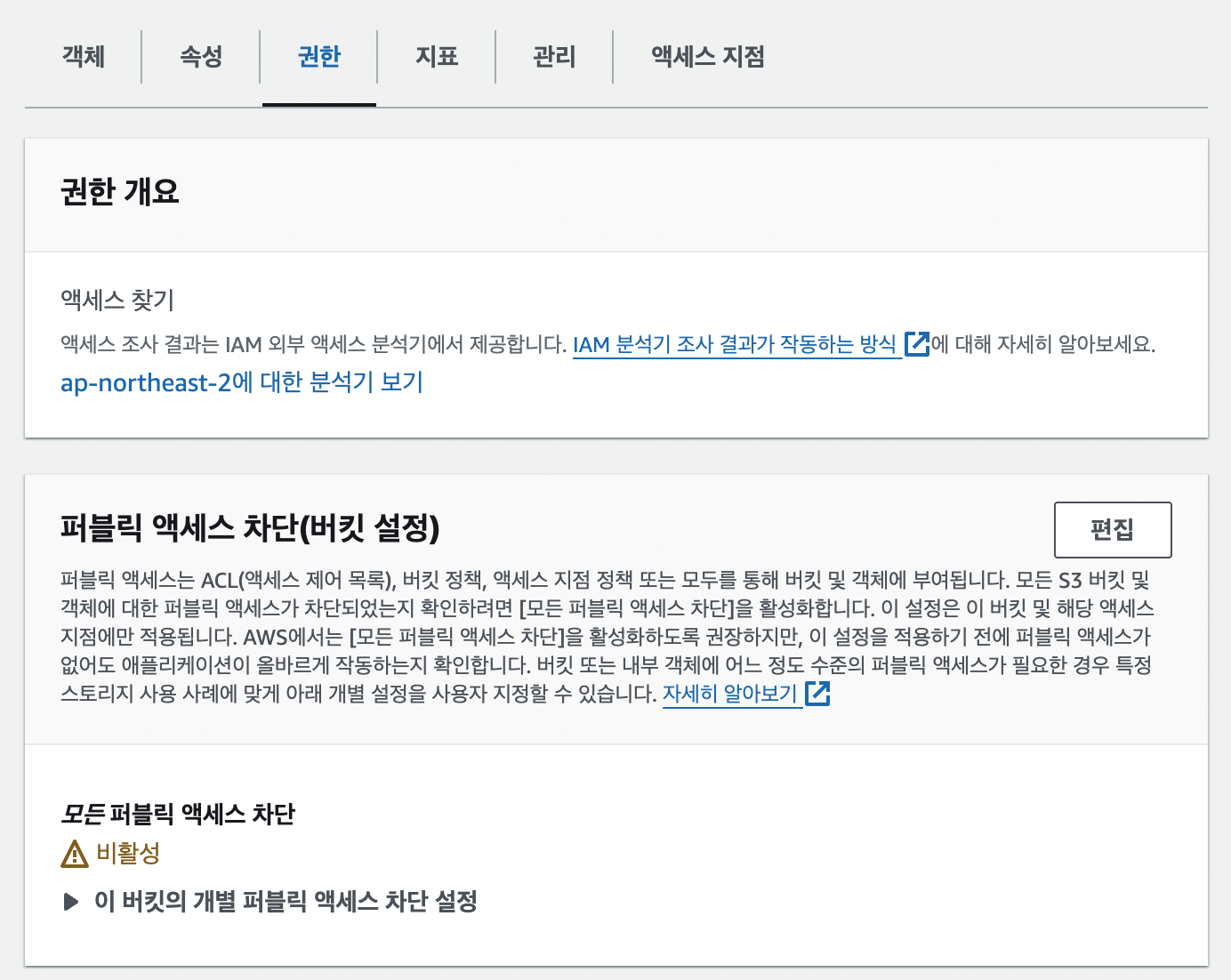S3에 버킷정책을 생성해서 액세스 권한을 주면 해결이 된다.