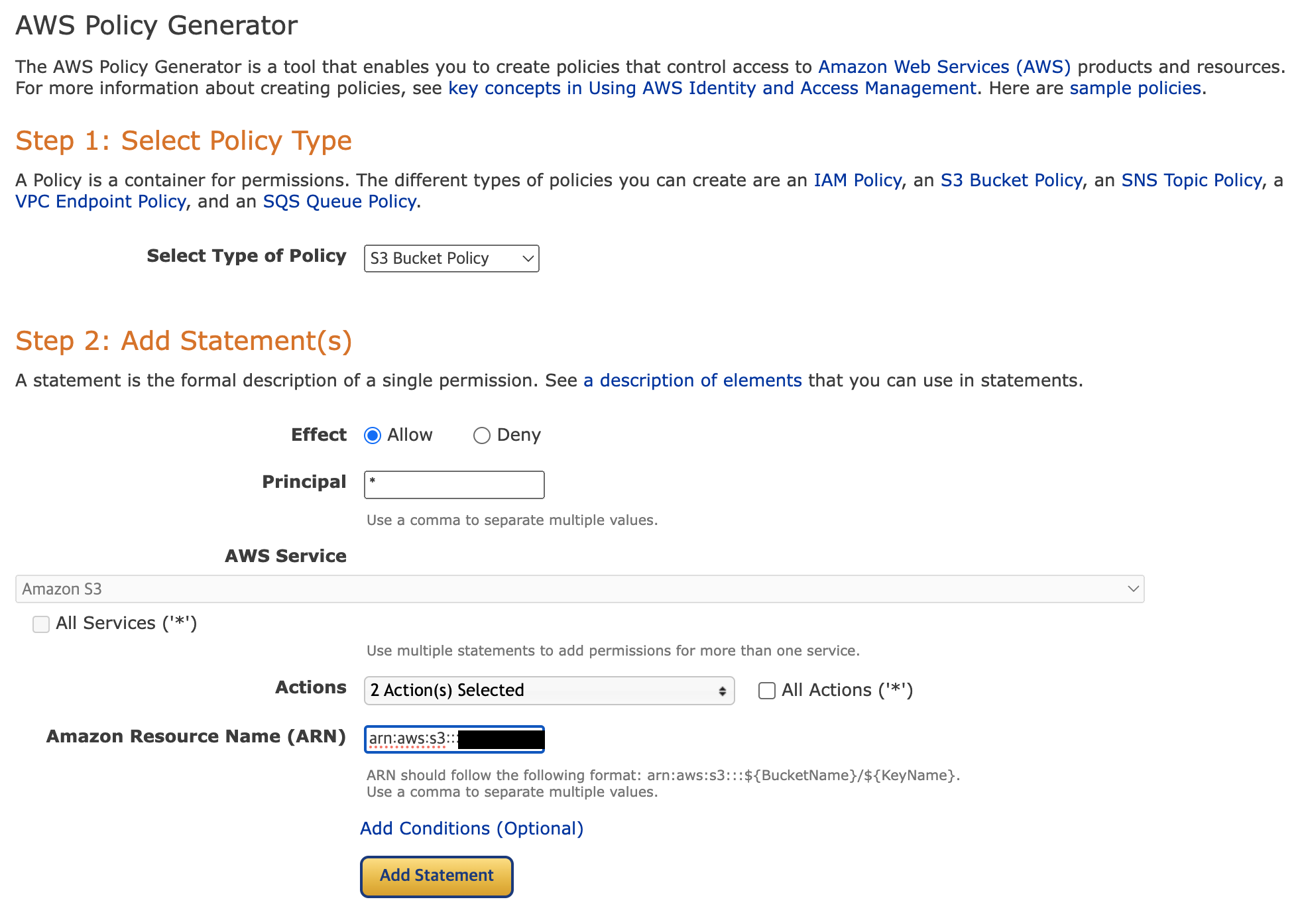 권한 > 버킷 정책 > 편집 > 정책 생성기