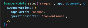 현재는 .setup() 함수에 swagger ui 접속 경로, 생성 모듈, API 문서 설정, Swagger UI 정렬 옵션 만 보내주고있다.